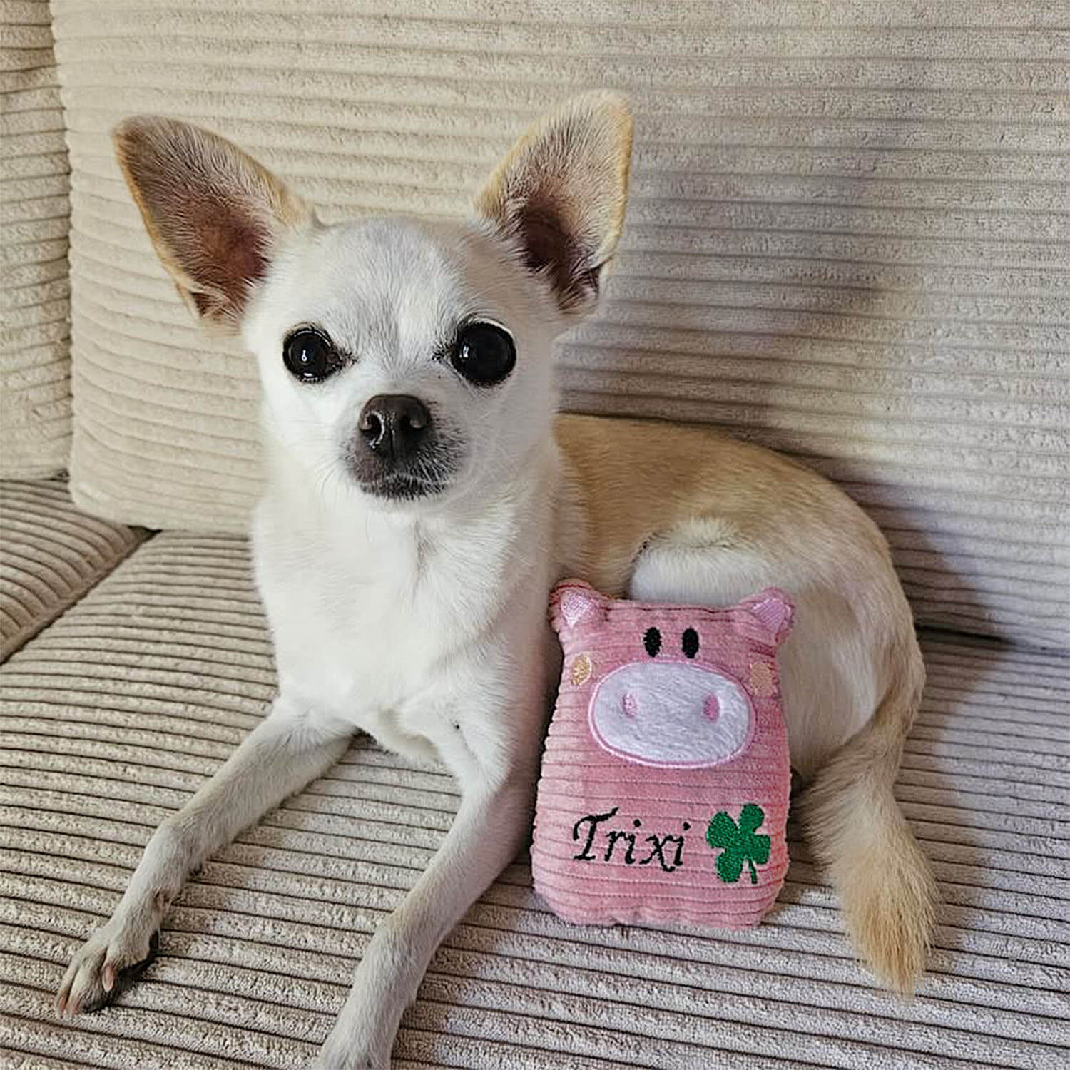 Wer unserem Schweini einmal in die treuen Augen schaut, ist verloren. Das gilt übrigens für Vier- und Zweibeiner. Schweini ist ein schönes Kuschelspielzeug, welches sich für kleine und mittelgroße Hunde eignet. Dieses besteht aus weichem und robustem Cordstoff, welcher aus 100% aus Baumwollstoff besteht. Alle Herzensbrecher sind mit schadstoffgeprüfter (nach Öko-Tex Standard 100) Polyesterwatte gefüllt und werden mit dem Namen des Hundes bestickt. Bei beiden Größen besteht die Möglichkeit eine Quietsche in den Bauch einzuarbeiten.