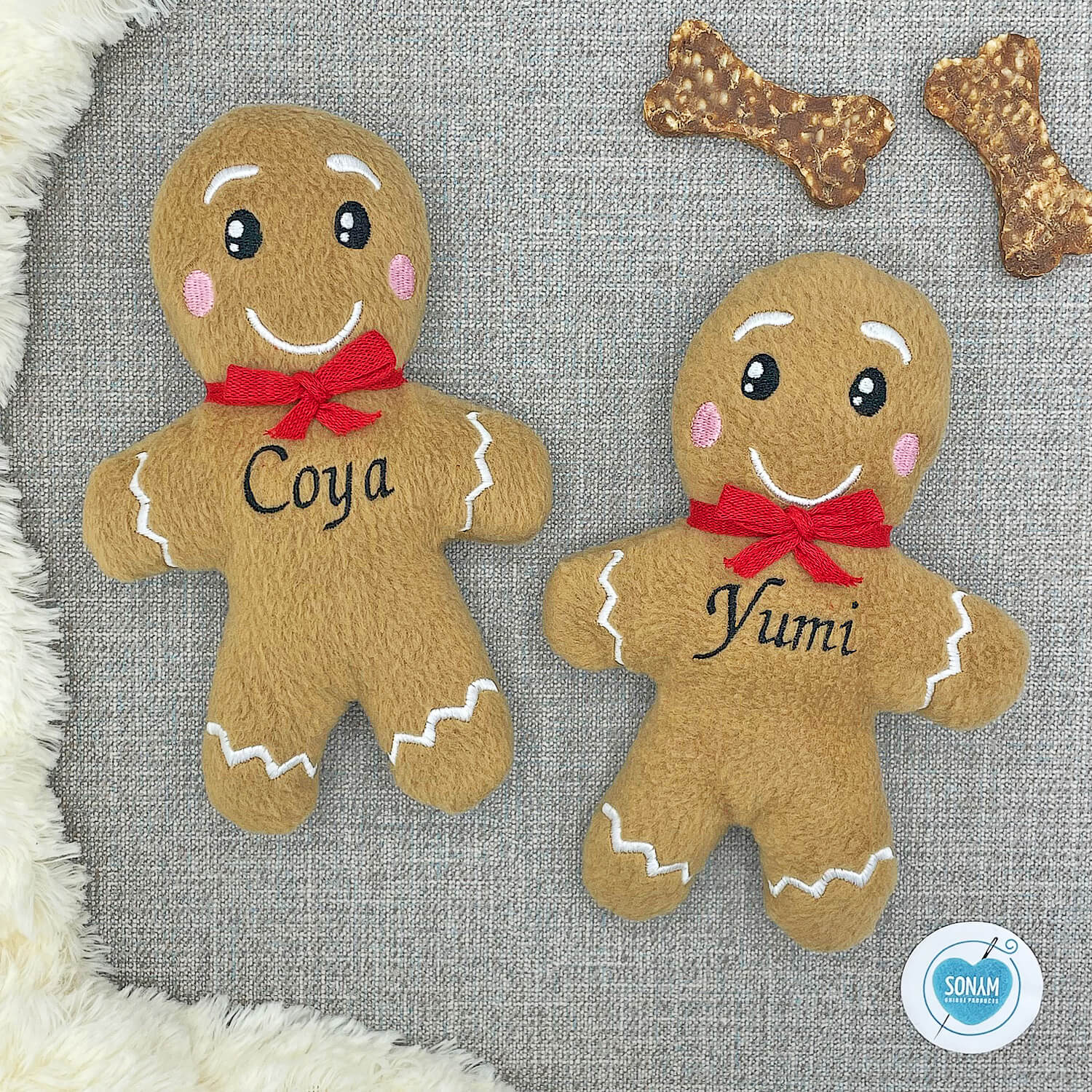 Wer unserem Lebkuchen Gingy einmal in die treuen Augen schaut, ist verloren. Das gilt übrigens für Vier- und Zweibeiner. Unser süßer Lebkuchen ist ein schönes Kuschelspielzeug, welches sich für kleine und mittelgroße Hunde eignet. Es besteht aus kuschelig weichem Fleecestoff (100% Polyester) und hat keine abstehenden Einzelteile, die abgebissen oder verschluckt werden können. Der niedliche Lebkuchen ist mit schadstoffgeprüfter (nach Öko-Tex Standard 100) Polyesterwatte gefüllt und wird mit dem Namen des Hundes bestickt. Es besteht die Möglichkeit eine Quietsche in den Bauch einzuarbeiten.